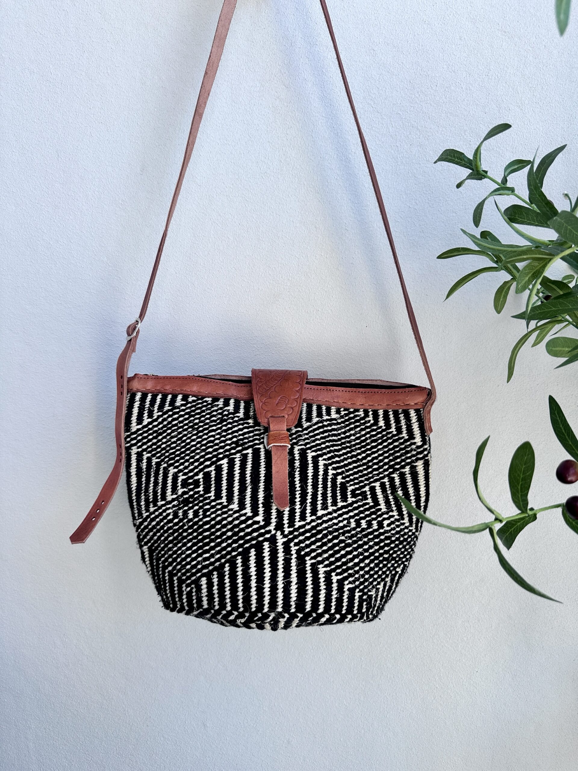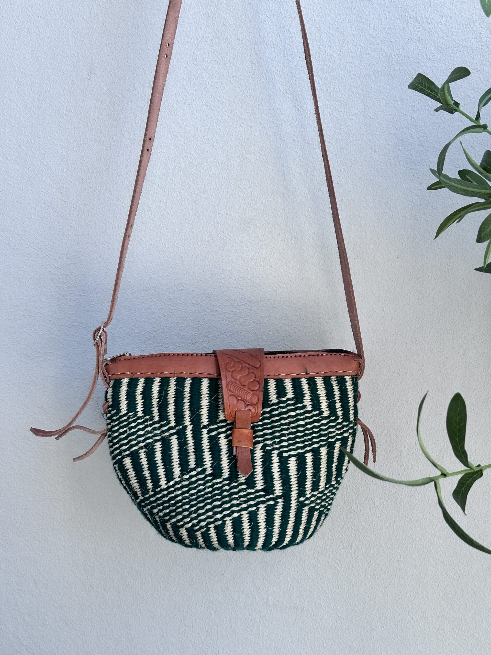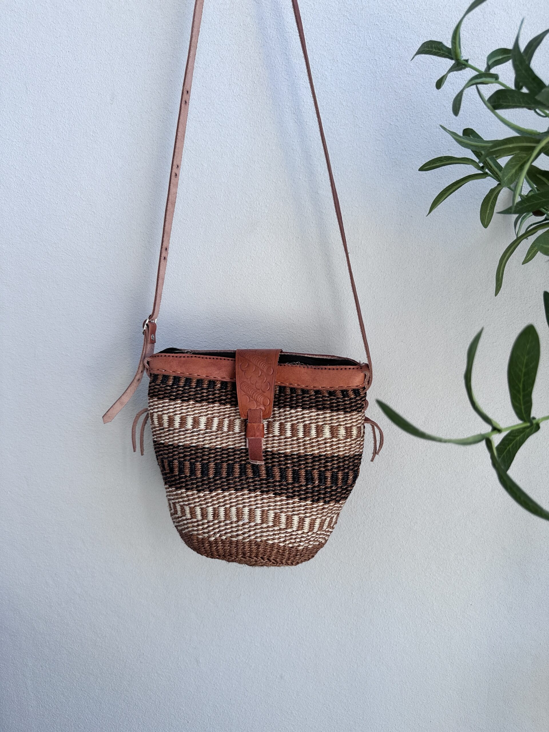 Made of woven sisal, leather, textile lining, zipper. Adjustable shoulder strap.